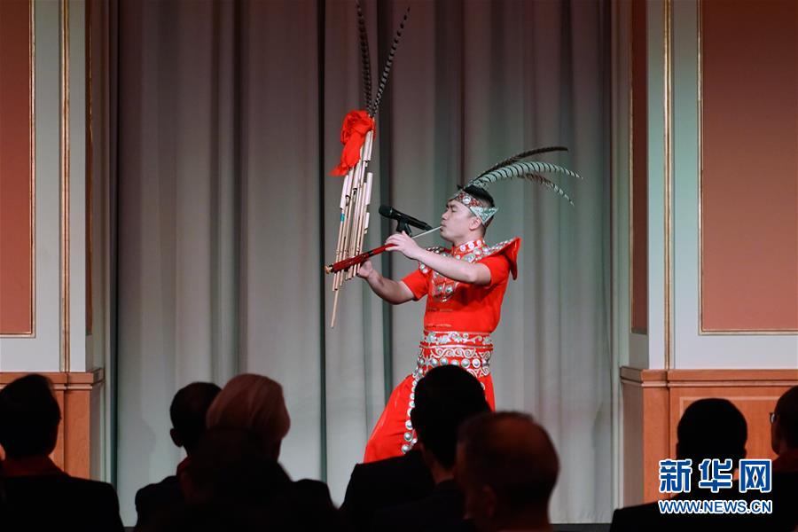 1月15日,在德國(guó)柏林,貴州省歌舞劇院藝術(shù)團(tuán)的演員在晚會(huì)上吹奏蘆笙。 15日晚,2020年“歡樂(lè)春節(jié)”新春文藝晚會(huì)在德國(guó)柏林的紅色市政廳上演,中德兩國(guó)各界代表觀看演出,共慶中國(guó)農(nóng)歷新年。 新華社記者 王勍 攝