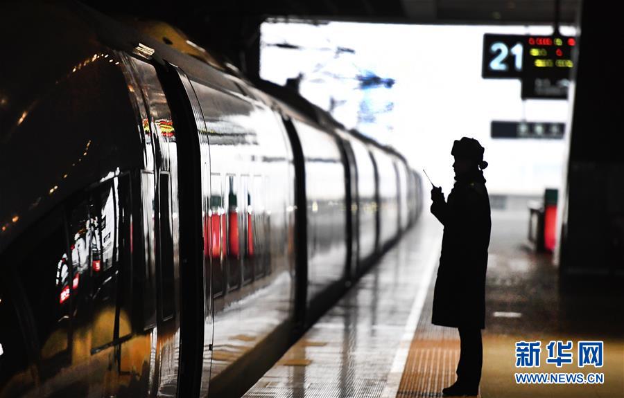 吉如在西安北站站臺上,與檢票口客運人員聯(lián)控(1月14日攝)。今年春運列車開行密度大,站臺崗位人員緊張,吉如時常被調(diào)到站臺進行站臺服務工作。 新華社記者 陶明 攝