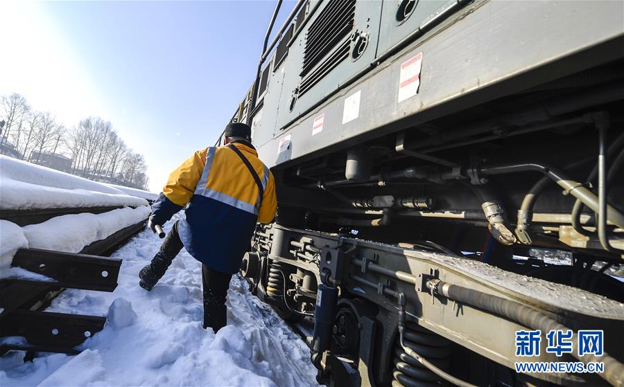 送水員黃衛(wèi)東在雪地中前行,準(zhǔn)備登上火車前往送水地點(diǎn)(1月17日攝)。新華社記者 許暢 攝