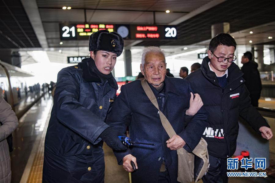 吉如(左一)在西安北站的站臺(tái)上協(xié)助旅客乘降,確保旅客安全乘車(1月14日攝)。今年春運(yùn)列車開行密度大,站臺(tái)崗位人員緊張,吉如時(shí)常被調(diào)到站臺(tái)進(jìn)行站臺(tái)服務(wù)工作。新華社記者陶明攝