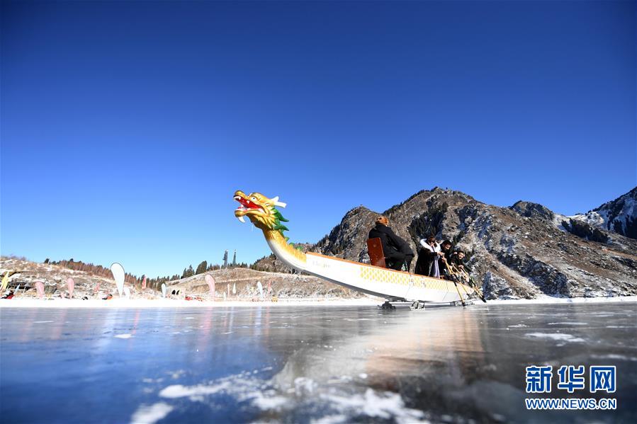 1月18日,游客在新疆天池景區(qū)玩冰上龍舟。新華社記者 沙達提 攝
