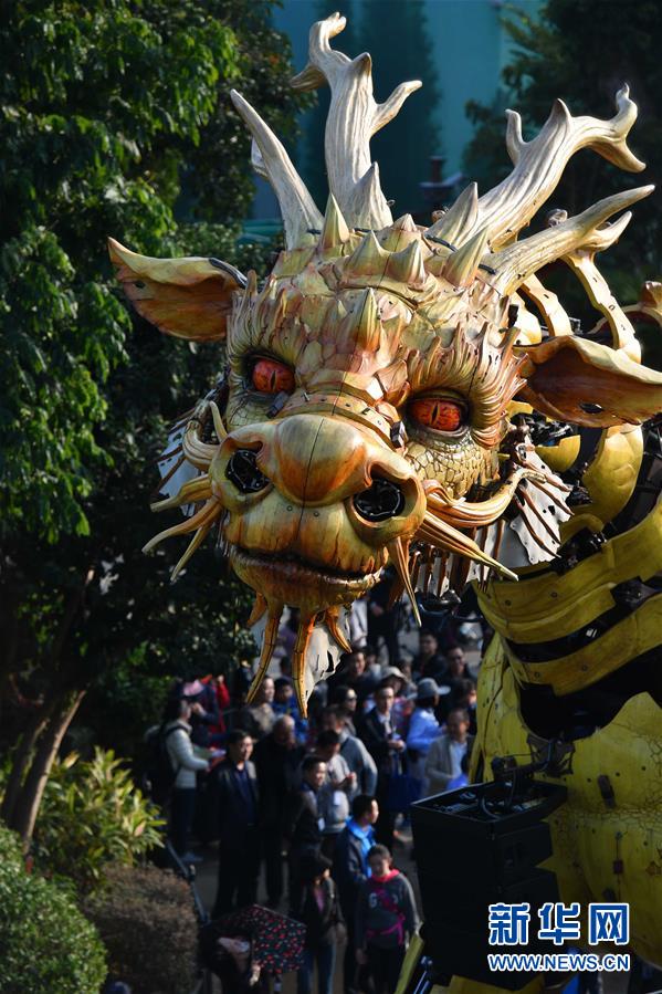 1月18日,大型機械裝置藝術(shù)品“龍馬精神”在珠海長隆海洋王國巡游展示。新華社記者 劉大偉 攝