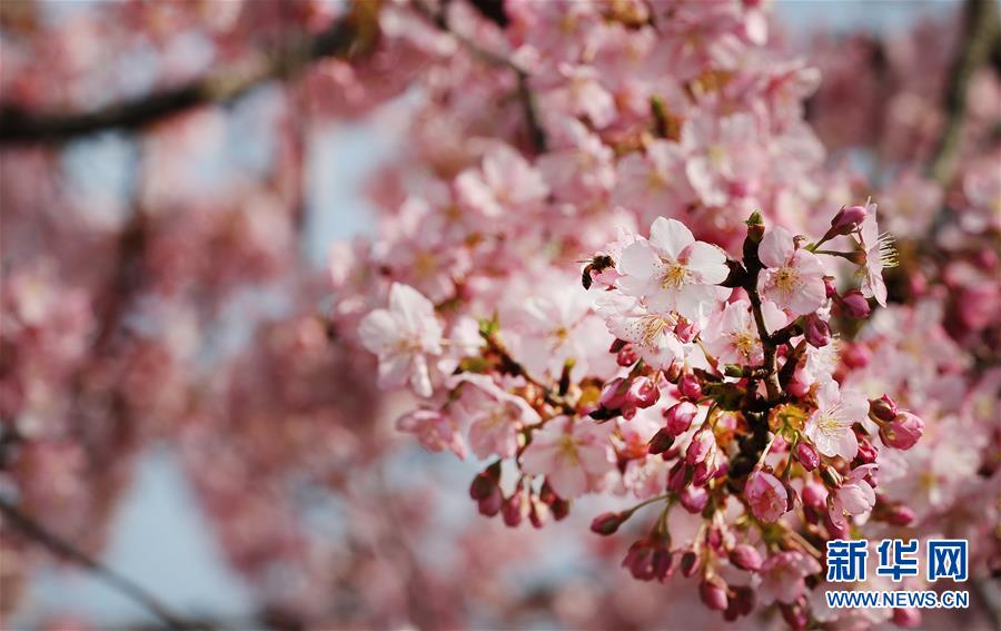 2月24日,蜜蜂在上海松江辰山植物園內(nèi)盛開(kāi)的河津櫻櫻花叢中飛舞。近日,上海松江區(qū)辰山植物園內(nèi)的河津櫻絢麗綻放,花團(tuán)錦簇間一派盎然春意。 新華社記者 方喆 攝