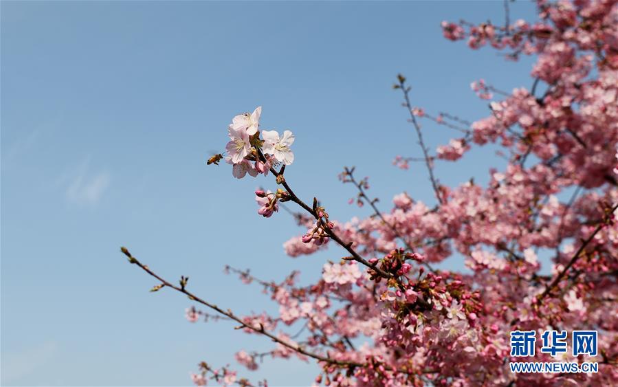 2月24日,在上海松江辰山植物園,蜜蜂在河津櫻櫻花叢中飛舞。 新華社記者 方喆 攝