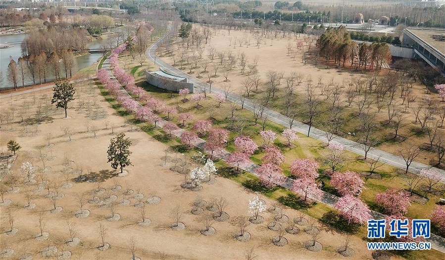 這是2月24日在上海松江辰山植物園內(nèi)拍攝的櫻花小徑(無人機(jī)照片)。 新華社記者 方喆 攝