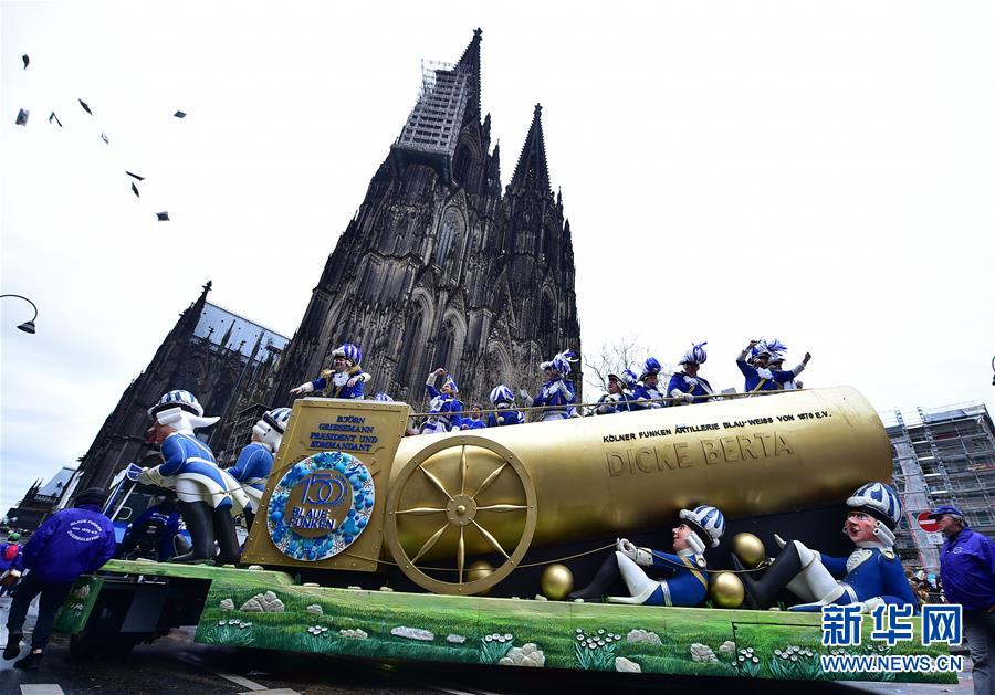 2月24日,在德國(guó)科隆,人們乘坐花車參加“玫瑰星期一”大游行。