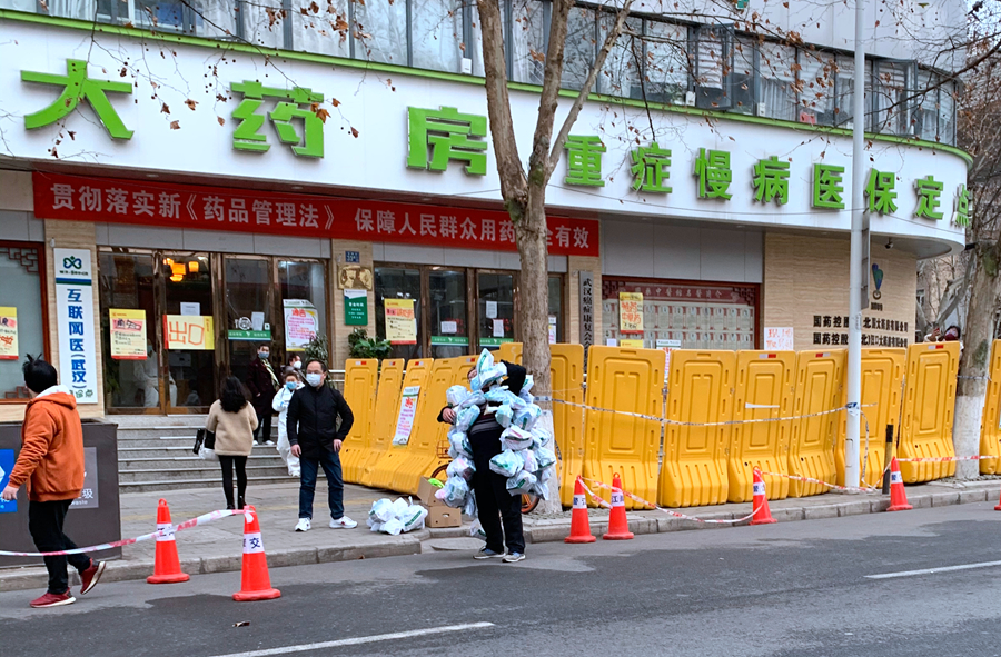 2月22日,王春波從藥店出發(fā),給周邊小區(qū)的居民送藥。新冠肺炎疫情防控工作啟動(dòng)以來,在決戰(zhàn)之地武漢,有一群“平民英雄”默默付出鮮為人知。他們雖不是醫(yī)護(hù)人員,但也活躍在城市抗擊疫情的各個(gè)戰(zhàn)線上,力所能及地幫助他人,義無反顧的堅(jiān)守自己的“戰(zhàn)場(chǎng)”,為抗擊疫情加油助力。近日,記者走近這群“平民英雄”,用鏡頭記錄下他們不平凡的身影。新華社記者熊琦攝