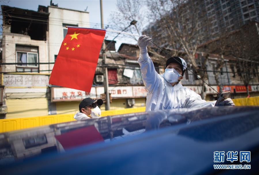 2月29日,W大武漢緊急救援隊(duì)隊(duì)長王紫懿(右)將國旗插在車上。 新華社記者 肖藝九 攝