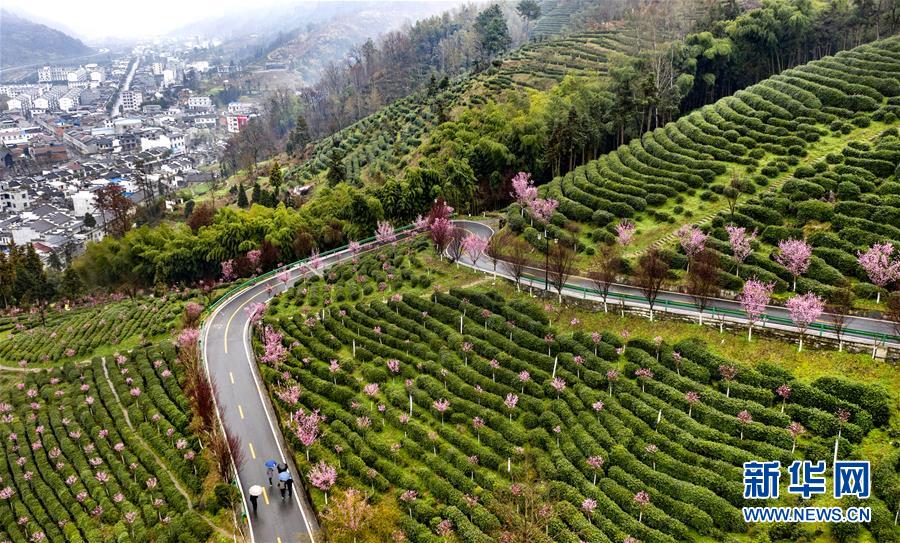 3月2日,游人在春雨中游覽平利縣長(zhǎng)安鎮(zhèn)洪福茶山(無(wú)人機(jī)照片)。新華社記者陶明攝