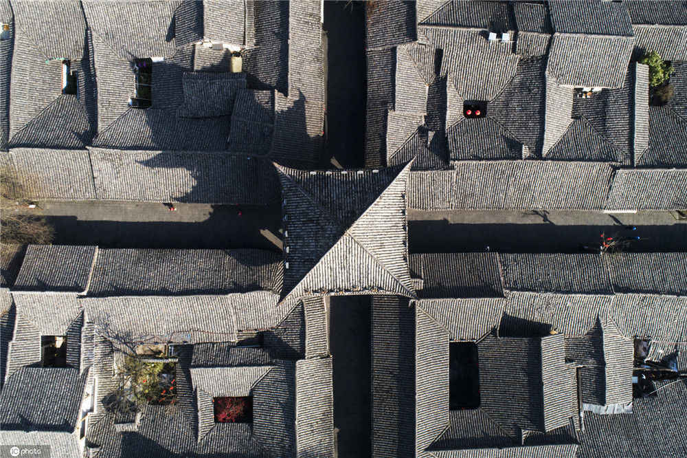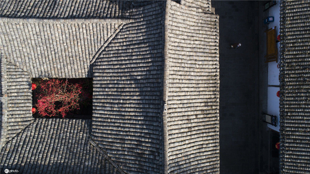 2020年2月21日,四川南充閬中古城中天樓旁,張家小院天井中的海棠在陽光中綻放(無人機拍攝)。