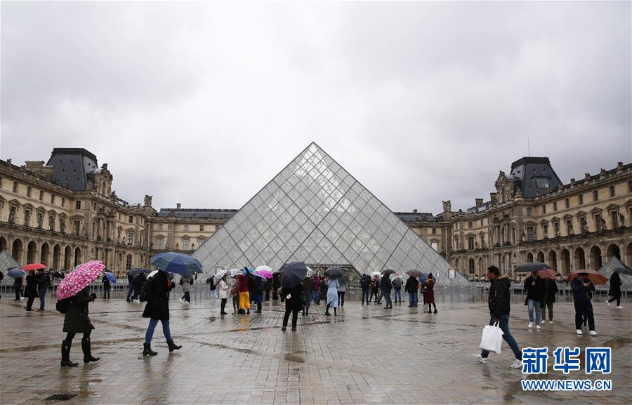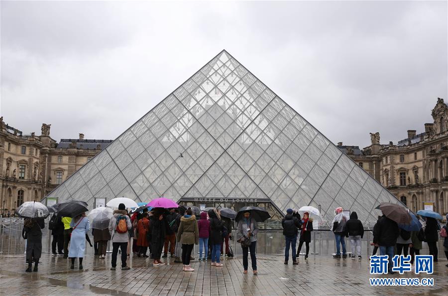 3月2日,在法國(guó)巴黎,游客撐傘走過(guò)盧浮宮的玻璃金字塔。新華社記者 高靜 攝