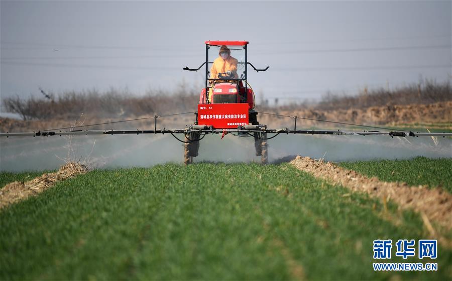 3月4日,建建農(nóng)機(jī)合作社社員在蒲城縣椿林鎮(zhèn)平峨村駕駛自走式高桿噴霧機(jī)為小麥噴灑除草殺菌劑。近日,為確保疫情期間不誤農(nóng)時(shí),陜西省蒲城縣植保植檢站組織縣內(nèi)7家農(nóng)作物病蟲害專業(yè)化防治單位,在小麥返青起身期,對(duì)麥田進(jìn)行除草及病蟲害的防控工作。新華社記者李一博攝