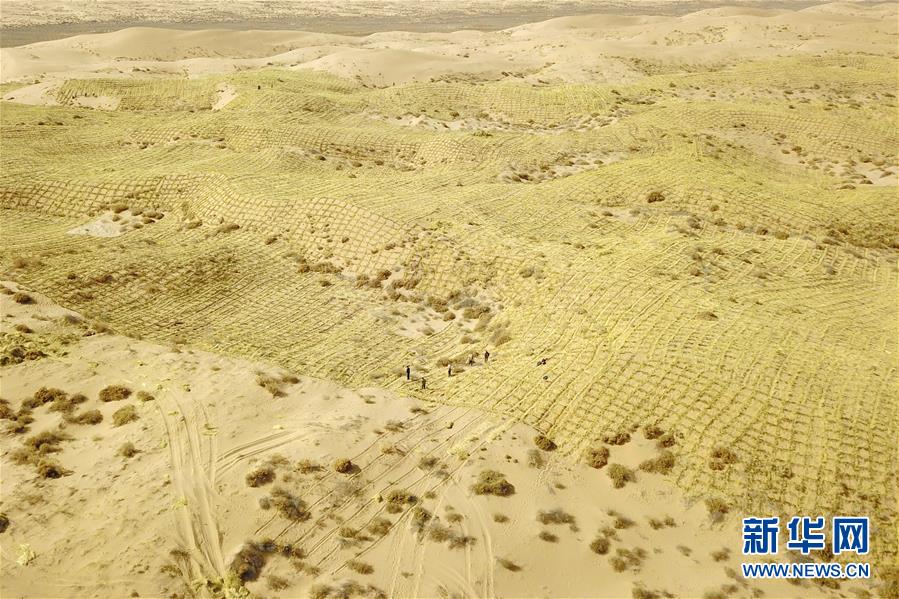 3月5日,在古浪縣北部沙區(qū)旱麻崗治沙點,群眾扎草方格壓沙(無人機照片)。初春時節(jié),在騰格里沙漠南緣的甘肅省武威市古浪縣,當?shù)馗刹柯毠ぜ鞍瞬缴沉謭鲋紊橙斯餐诳h城北部沙區(qū)旱麻崗治沙點開展春季治沙勞動。新華社記者 范培珅 攝
