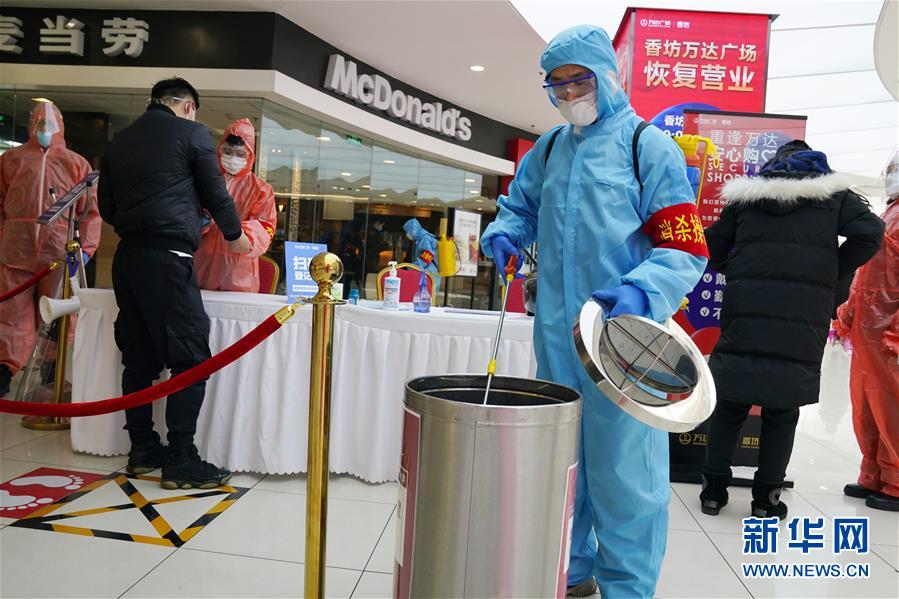 3月13日,在哈爾濱香坊萬達(dá)廣場內(nèi),工作人員在給垃圾桶消毒。 近日,哈爾濱市多家大型商場陸續(xù)恢復(fù)營業(yè)。這些恢復(fù)營業(yè)的商場采取多種措施,從嚴(yán)細(xì)致做好疫情防控和安全風(fēng)險防范工作,為廣大顧客提供安全放心的購物空間。 新華社記者 王建威 攝