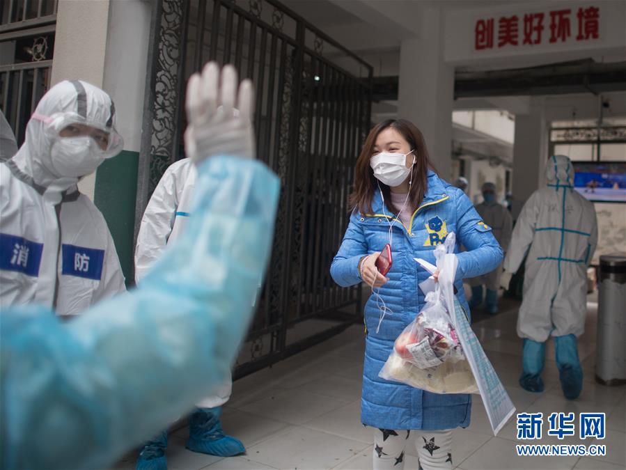3月12日,現(xiàn)場的工作人員與黎婧揮手告別。 3月12日,插畫師黎婧和84位病友離開自己居住的武漢軟件工程職業(yè)學院康復驛站,回到自己家中。他們都是治愈出院的新冠病毒肺炎患者,已經(jīng)在武漢軟件工程職業(yè)學院康復驛站進行了14天醫(yī)學觀察,達到醫(yī)學標準,成功解除隔離。他們由專車運送至所屬社區(qū)附近的集散點后,在社區(qū)工作人員的陪同下回家。 新華社記者 肖藝九 攝