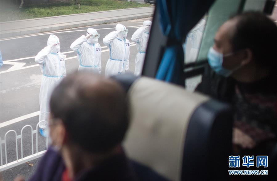 3月12日,臨出發(fā)前,公安民警向車上的治愈患者敬禮。 3月12日,插畫師黎婧和84位病友離開自己居住的武漢軟件工程職業(yè)學(xué)院康復(fù)驛站,回到自己家中。他們都是治愈出院的新冠病毒肺炎患者,已經(jīng)在武漢軟件工程職業(yè)學(xué)院康復(fù)驛站進(jìn)行了14天醫(yī)學(xué)觀察,達(dá)到醫(yī)學(xué)標(biāo)準(zhǔn),成功解除隔離。他們由專車運(yùn)送至所屬社區(qū)附近的集散點(diǎn)后,在社區(qū)工作人員的陪同下回家。 新華社記者 肖藝九 攝