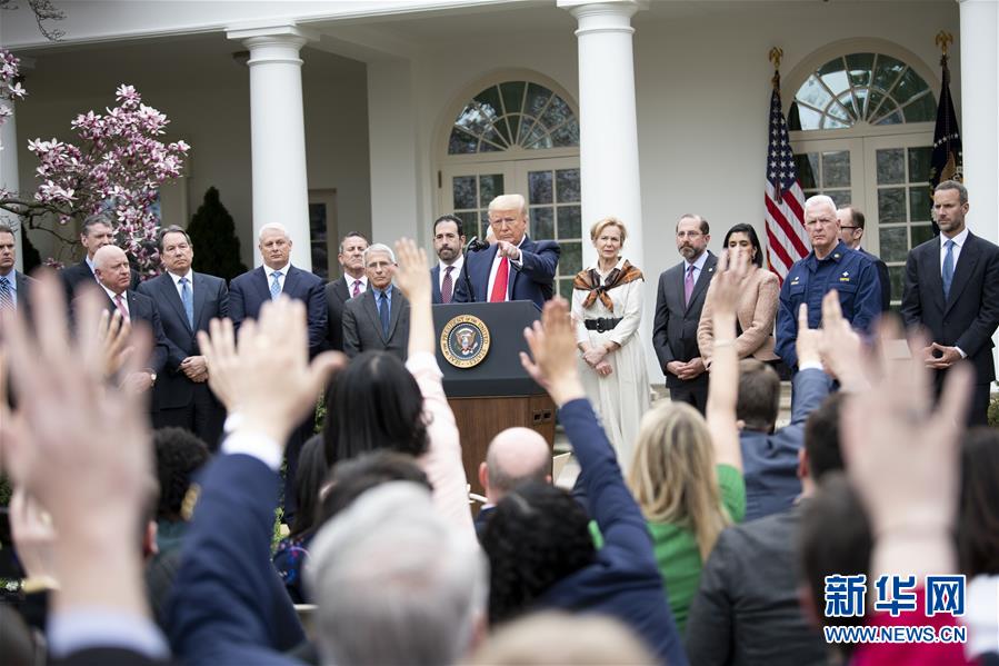 3月13日,在美國華盛頓白宮,美國總統(tǒng)特朗普(中)出席記者會。特朗普當天下午在白宮發(fā)表講話時正式宣布“國家緊急狀態(tài)”。他說,此舉旨在讓美國聯(lián)邦政府全力投入到抗擊新冠肺炎疫情的努力中。這項舉措將釋放500億美元資金,幫助各州和地方政府應對疫情。新華社記者劉杰攝
