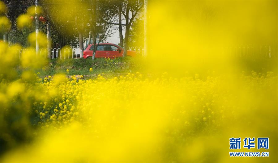 3月14日,在武漢市西北部市郊,一輛汽車從油菜花田前駛過。隨著氣溫升高,春意在武漢的枝頭上萌動,花朵漸次開放。新華社記者肖藝九攝