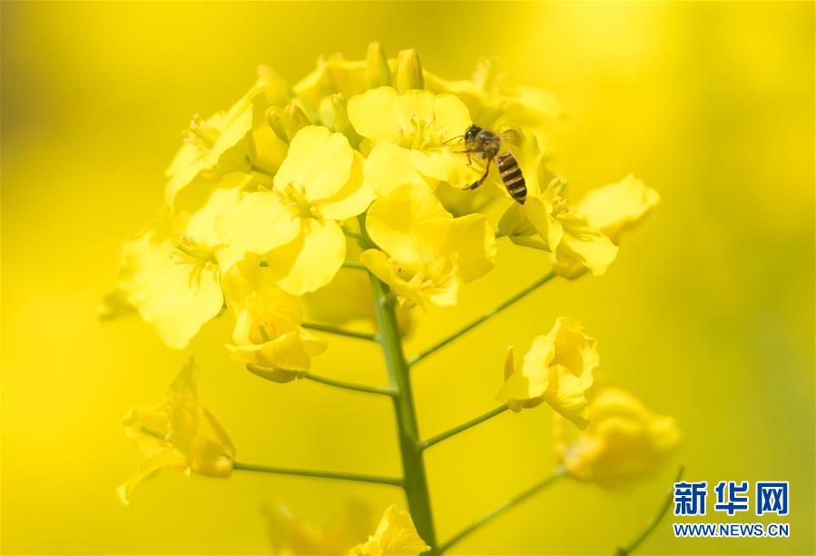 3月14日,在武漢市西北部市郊,蜜蜂在油菜花上采蜜。隨著氣溫升高,春意在武漢的枝頭上萌動,花朵漸次開放。新華社記者肖藝九攝