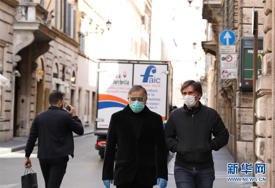 3月10日,在意大利首都羅馬,兩名男子戴著口罩出行。新華社記者程婷婷攝