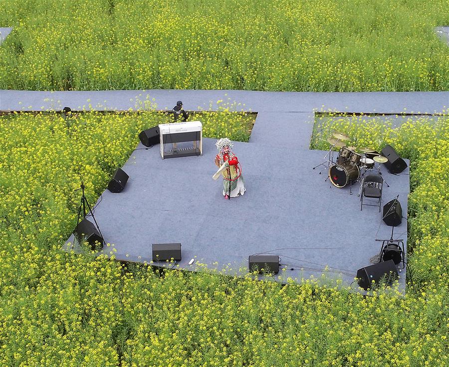 3月16日,演員在李坑村的油菜花田里表演。 新華社記者 萬象 攝