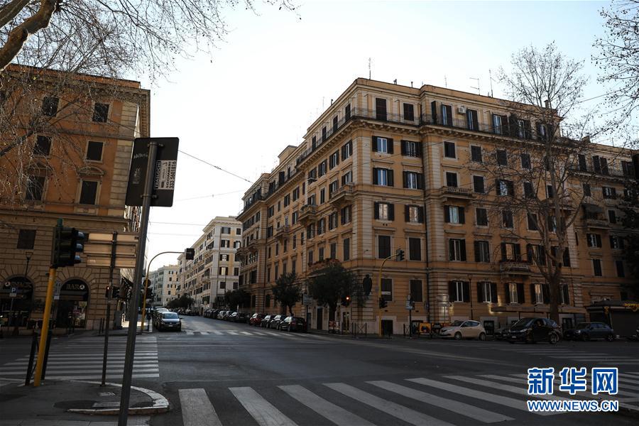 這是3月14日在意大利首都羅馬拍攝的空蕩蕩的街道。新華社記者劉詠秋攝
