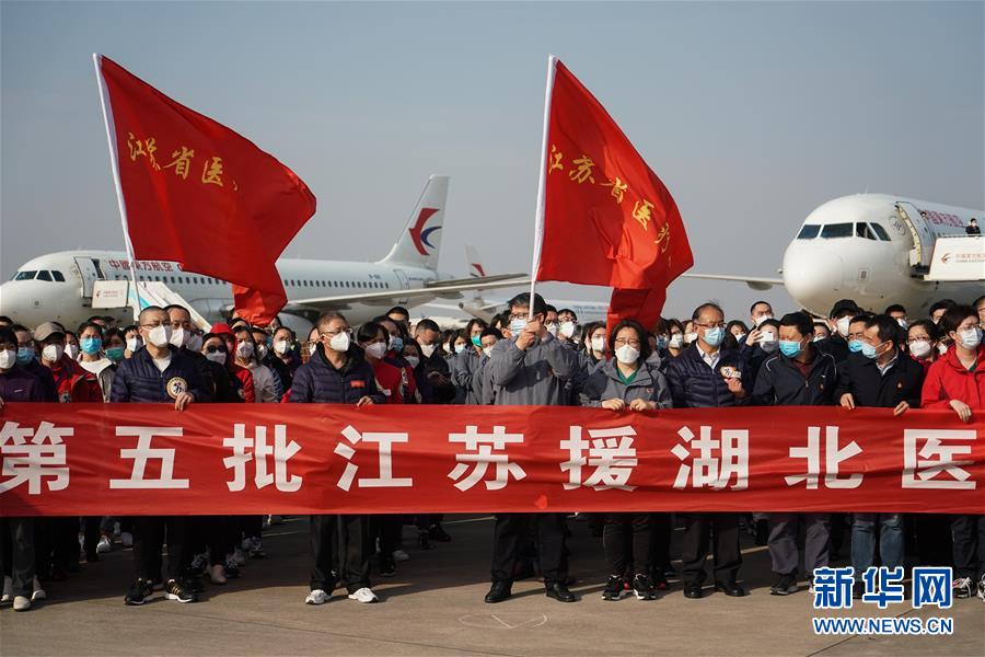 3月17日,在江蘇南京祿口國(guó)際機(jī)場(chǎng),醫(yī)療隊(duì)隊(duì)員參加歡迎儀式。新華社記者季春鵬攝