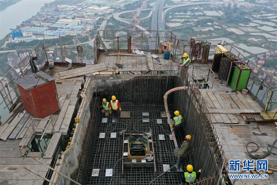 3月18日,施工人員在廣州南沙港鐵路跨西江斜拉橋東主塔進(jìn)行封頂施工(無人機照片)。新華社記者劉大偉攝