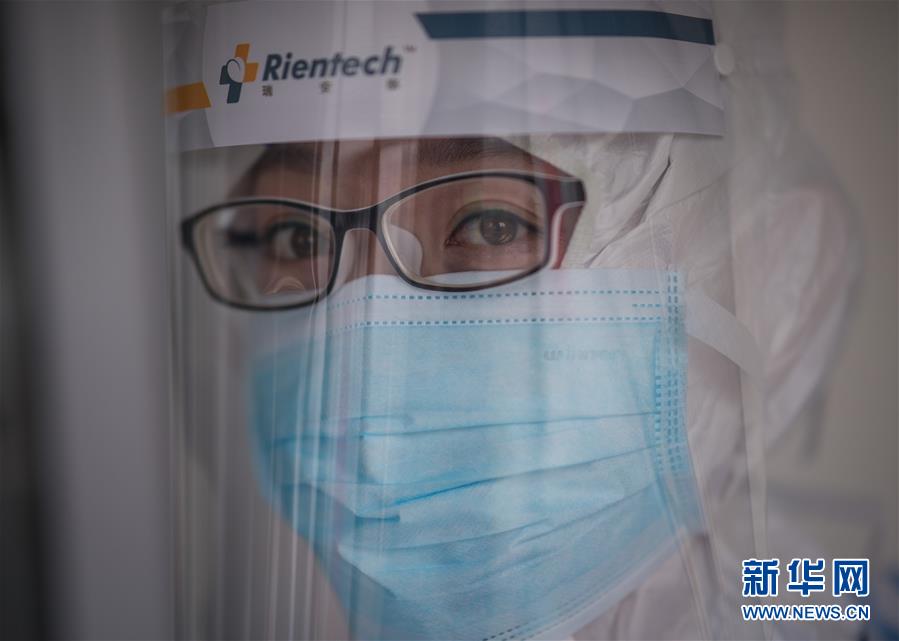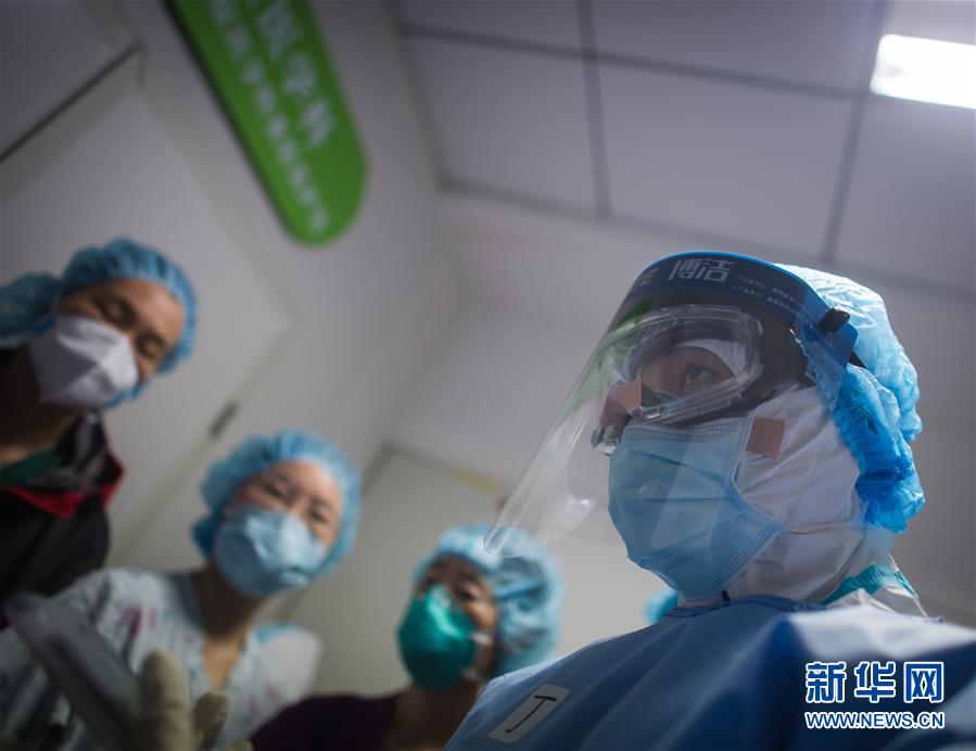 3月19日,在武漢市肺科醫(yī)院隔離病房,海南醫(yī)療隊隊員詹才露在現(xiàn)場忙碌。 新華社記者 肖藝九 攝