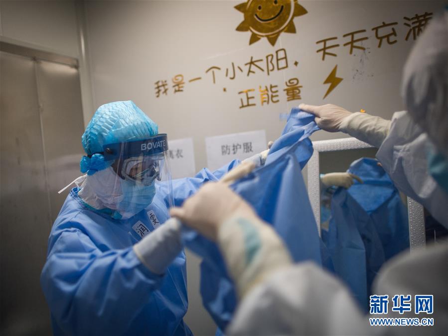 3月19日,在武漢市肺科醫(yī)院清潔區(qū),浙江醫(yī)療隊隊員在穿戴防護服。 新華社記者 肖藝九 攝