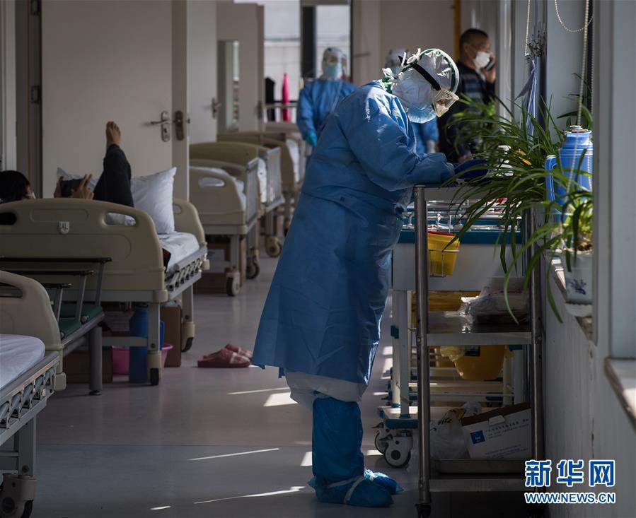 3月19日,在武漢市肺科醫(yī)院隔離病房,內(nèi)蒙古醫(yī)療隊(duì)隊(duì)員陳亮在現(xiàn)場忙碌。 新華社記者 肖藝九 攝