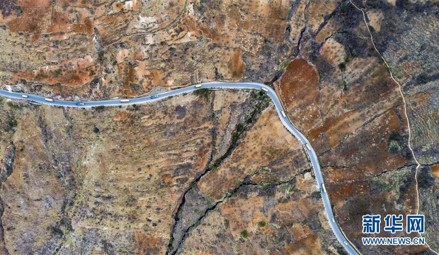 搬家的車隊(duì)在開道警車的引領(lǐng)下從云南省永善縣大興鎮(zhèn)開往魯?shù)榭h卯家灣易地扶貧安置區(qū)(3月15日攝,無人機(jī)照片)。 新華社記者 江文耀 攝