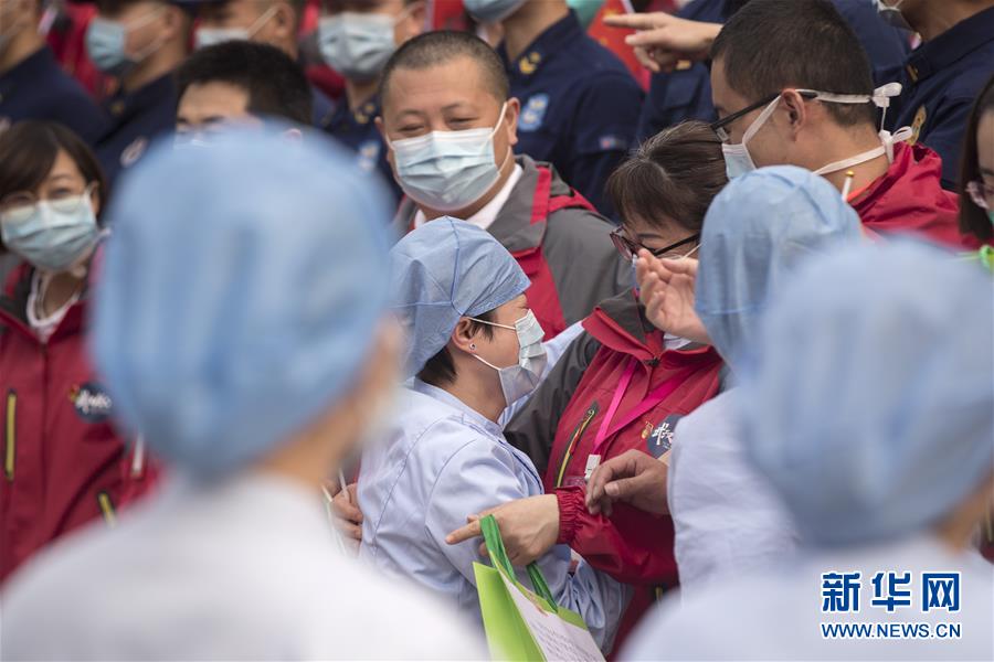3月21日,武漢市第一醫(yī)院的護(hù)士長杜沛(中左一)與天津市醫(yī)療隊(duì)隊(duì)員道別。杜沛是負(fù)責(zé)與天津市醫(yī)療隊(duì)對(duì)接的護(hù)士長。新華社記者費(fèi)茂華攝