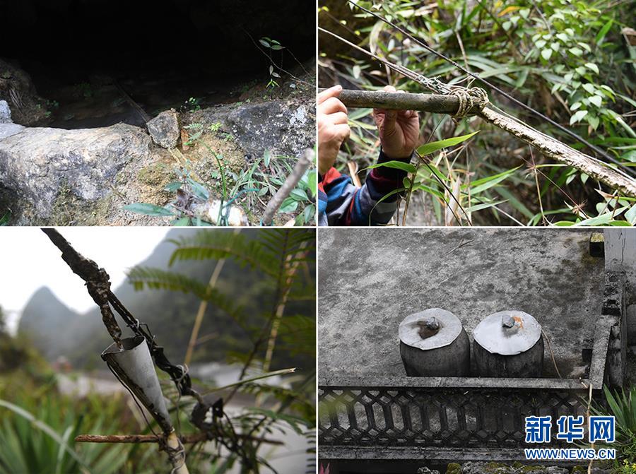 這張拼版圖片顯示廣西都安瑤族自治縣澄江鎮(zhèn)自成村加倫屯村民黃景飛獨(dú)創(chuàng)的“鐵線引水”法(2018年3月16日攝)。左上圖為竹枧將山泉水從山洞引出;右上圖為竹枧將山泉水引到鐵線上;左下圖為一個特制的漏斗將水接入膠管里;右下圖為膠管將山泉水送到水缸里。廣西有近一半貧困人口生活在石漠化地區(qū),涉及數(shù)十個縣區(qū)。這里也是廣西飲水保障程度最低的地區(qū),解決貧困人口飲水問題是廣西脫貧攻堅戰(zhàn)“硬仗中的硬仗”?!笆濉币詠?,廣西加快實(shí)施農(nóng)村飲水安全鞏固提升工程。因地制宜,采取新建、擴(kuò)建及管網(wǎng)延伸等多種措施,補(bǔ)齊貧困地區(qū)水利薄弱短板,進(jìn)一步提升石漠化地區(qū)群眾飲水安全保障水平,助推脫貧攻堅。新華社記者陸波岸攝