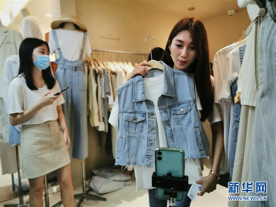 在廣州市新中國大廈內(nèi),一家服裝檔口的員工在用手機進行直播(3月21日攝)。新華社記者胡林果攝