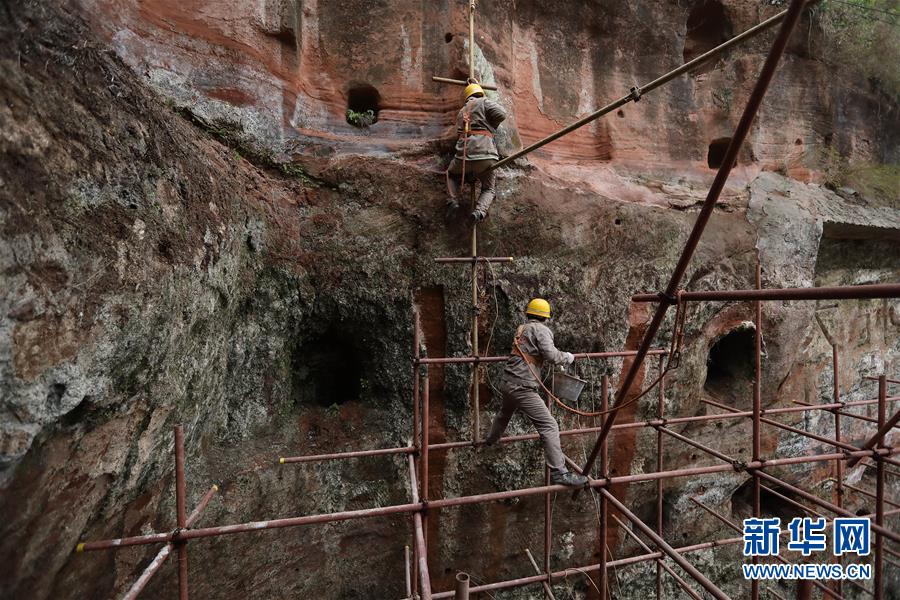 中鐵西北科學(xué)研究院有限公司文保中心的工作人員對(duì)大佛巖體進(jìn)行保護(hù)性清理(3月17日攝)。新華社記者江宏景攝