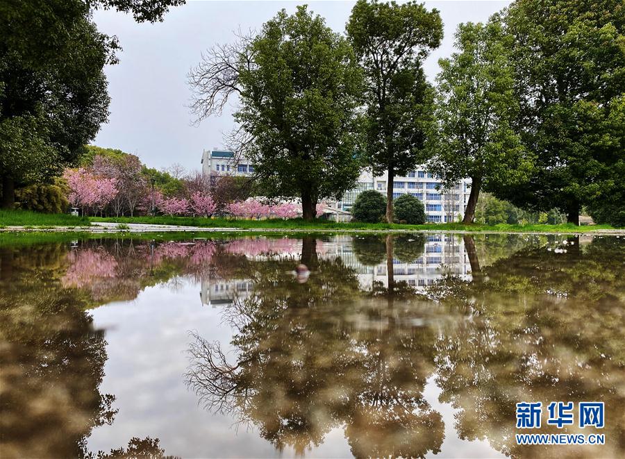 近日,隨著氣溫上升,武漢大學(xué)圖書館附近一片櫻花開放。新華社記者費(fèi)茂華攝