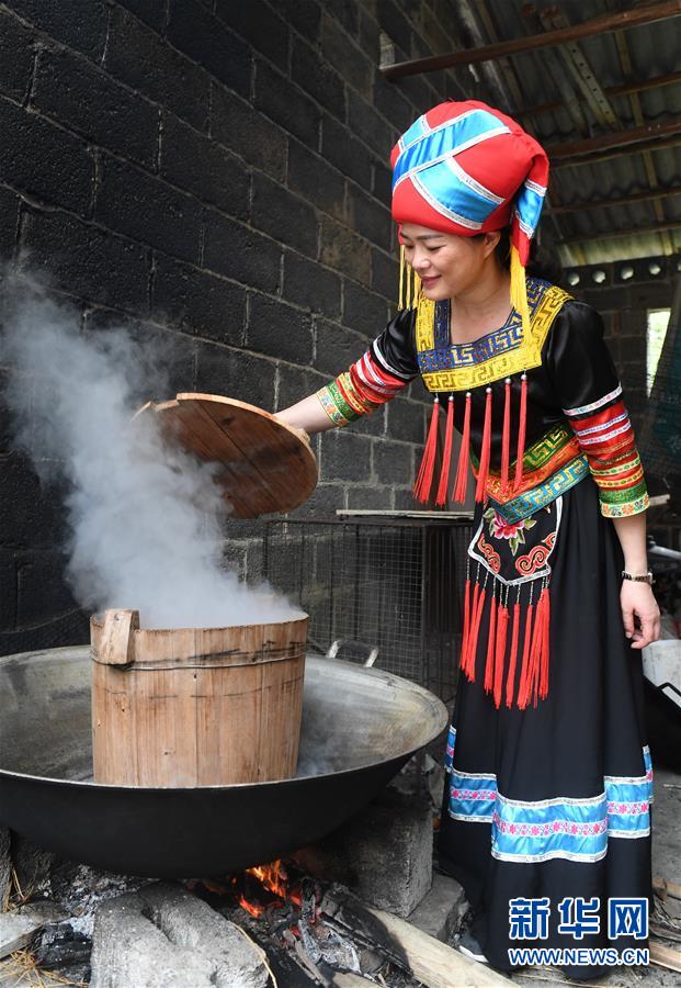 4月17日,在貴州省臺江縣姊妹街哆蝶五彩姊妹飯體驗店,苗家婦女在蒸煮五彩“姊妹飯”。新華社記者楊文斌攝