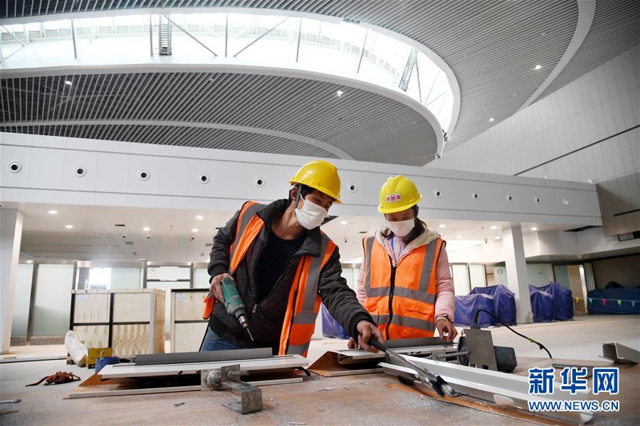 3月25日,兩名工人在青島膠東國際機(jī)場航站樓中央景觀區(qū)施工。新華社記者李紫恒攝