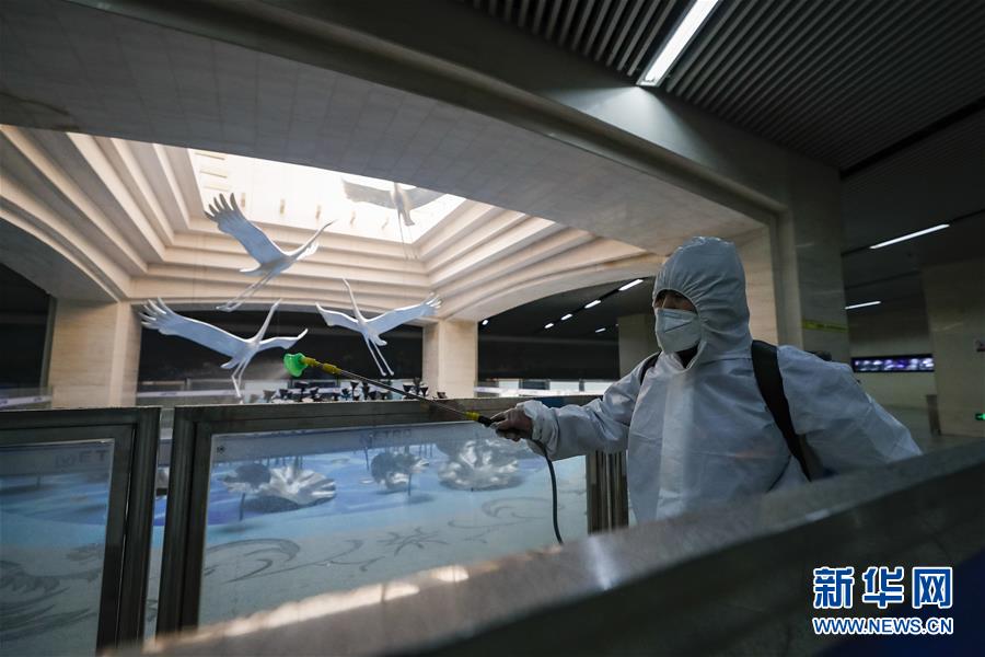 3月23日,在漢口火車(chē)站地鐵站,保潔人員在為站廳乘客通道消毒。目前,武漢城市功能和市民生活正逐步有序恢復(fù),地鐵、公交車(chē)系統(tǒng)已啟動(dòng)全面消殺和張貼乘客健康二維碼識(shí)別等舉措,為恢復(fù)運(yùn)營(yíng)做準(zhǔn)備。新華社記者沈伯韓攝
