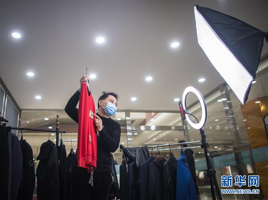 3月29日,在漢口北市場(chǎng),一名主播在直播平臺(tái)直播銷售一款服裝。新華社記者肖藝九攝