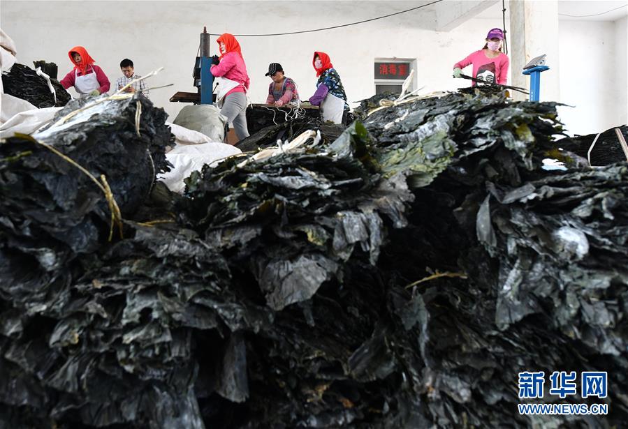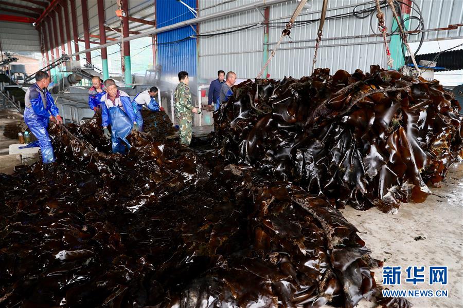 大欽島鄉(xiāng)東村居民在加工海帶(5月23日攝)。新華社記者朱崢攝