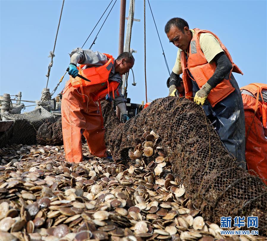 漁民在海洋牧場打撈扇貝(7月8日攝)。新華社記者姚劍鋒攝