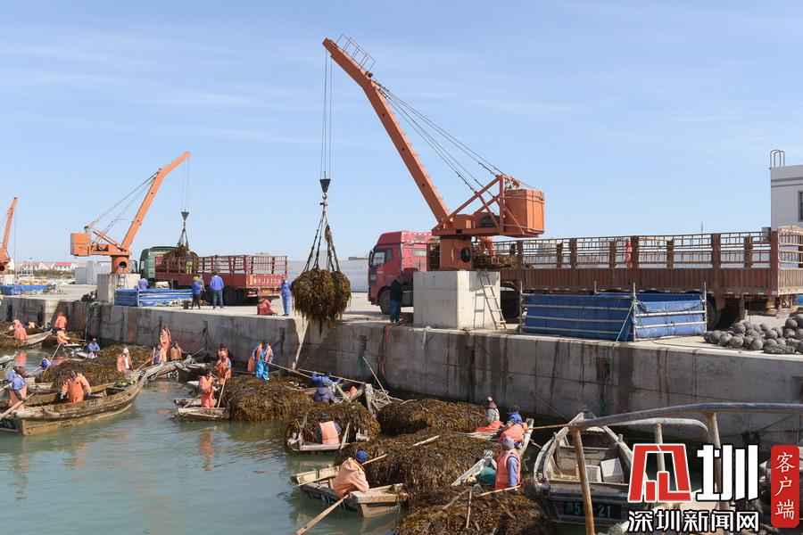 4月10日,霞浦縣長春鎮(zhèn)海帶養(yǎng)殖戶在埕塢碼頭吊運海帶。新華社記者姜克紅攝
