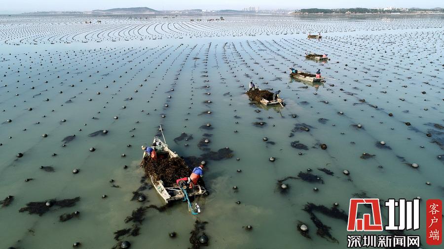 場面壯觀!山東威海收割海帶