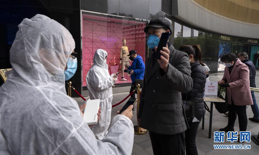 3月30日,在武漢市武商廣場外,人們在工作人員指引下,用手機掃描健康碼后進入商場購物。當日,武漢市多家商場開門迎客。新華社記者沈伯韓攝