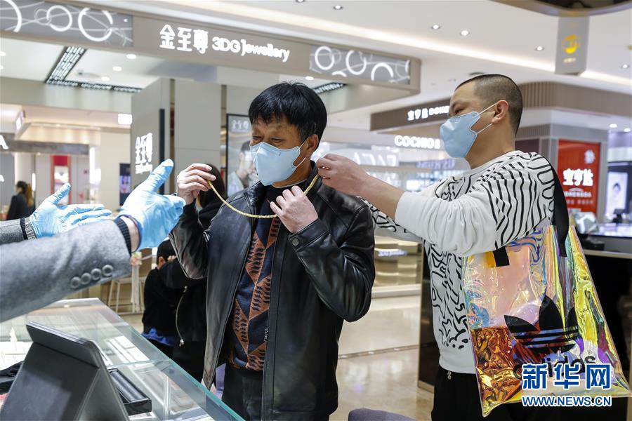 3月30日,在武漢市武商世貿(mào)廣場(chǎng),顧客(右二)在挑選飾品。當(dāng)日,武漢市多家商場(chǎng)開(kāi)門迎客。新華社記者沈伯韓攝