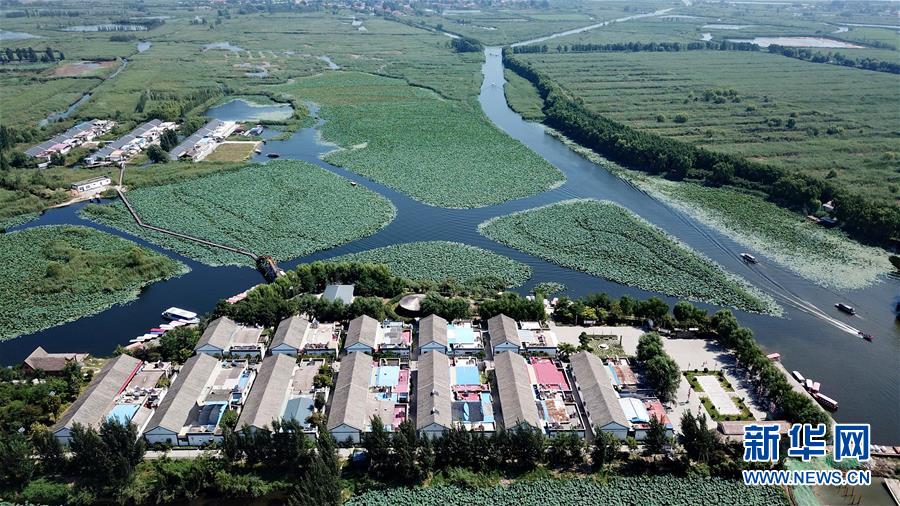 游客在白洋淀景區(qū)內(nèi)游覽(8月31日無(wú)人機(jī)拍攝)。新華社記者牟宇攝