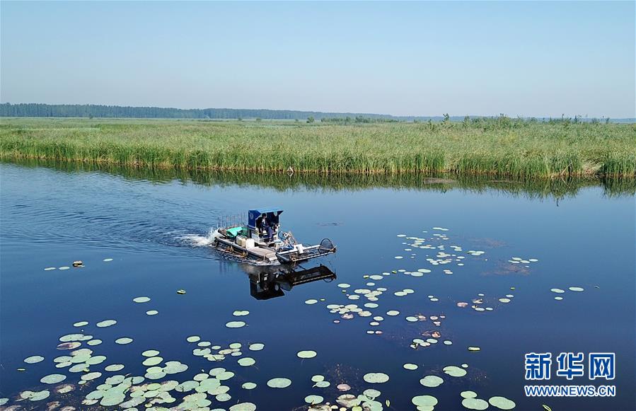 一艘打撈船在白洋淀景區(qū)內(nèi)清理漂浮物(8月31日無(wú)人機(jī)拍攝)。新華社記者牟宇攝