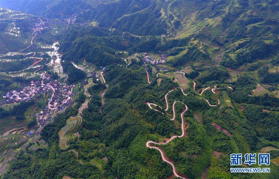 這是融水苗族自治縣桿洞鄉(xiāng)百秀村孔門(mén)苗寨的公路(6月14日無(wú)人機(jī)拍攝)。新華社記者黃孝邦攝